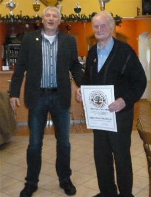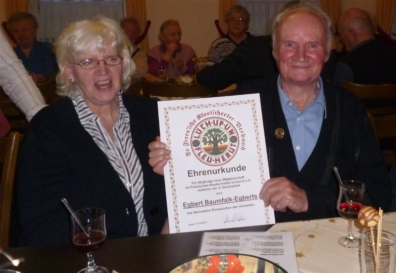 Im Rahmen der Senioren-Weihnachtsfeier, die wiederum vom Frauenkreis Utgast ausgerichtet wurde, wurden zwei Vereinsmitglieder für langjährige Mitgliedschaft geehrt. Seit mehr als 60 Jahren sind Egbert Baumfalk-Egberts und Poppe Osterkamp Mitglied im KBV "Fresena" Utgast e.V. Für diese langjährige Treue zu unserem Verein wurden sie vom Vorsitzenden des Kreisverbandes Esens, Folkmar Lüpkes, mit der Diamantenen Ehrennadel des Friesischen Klootschießerverbandes ausgezeichnet.